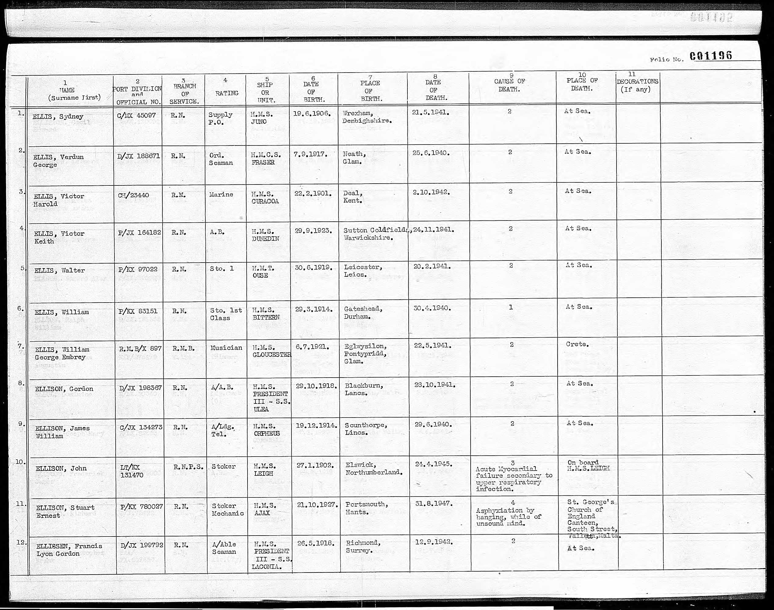 Research shows that William was a musician serving with the Royal Marines. In 1941 he was serving aboard HMS Gloucester when she was hit by enemy fire and sank during the Battle of Crete on 22nd May. Many men lost their lives that day including William.
